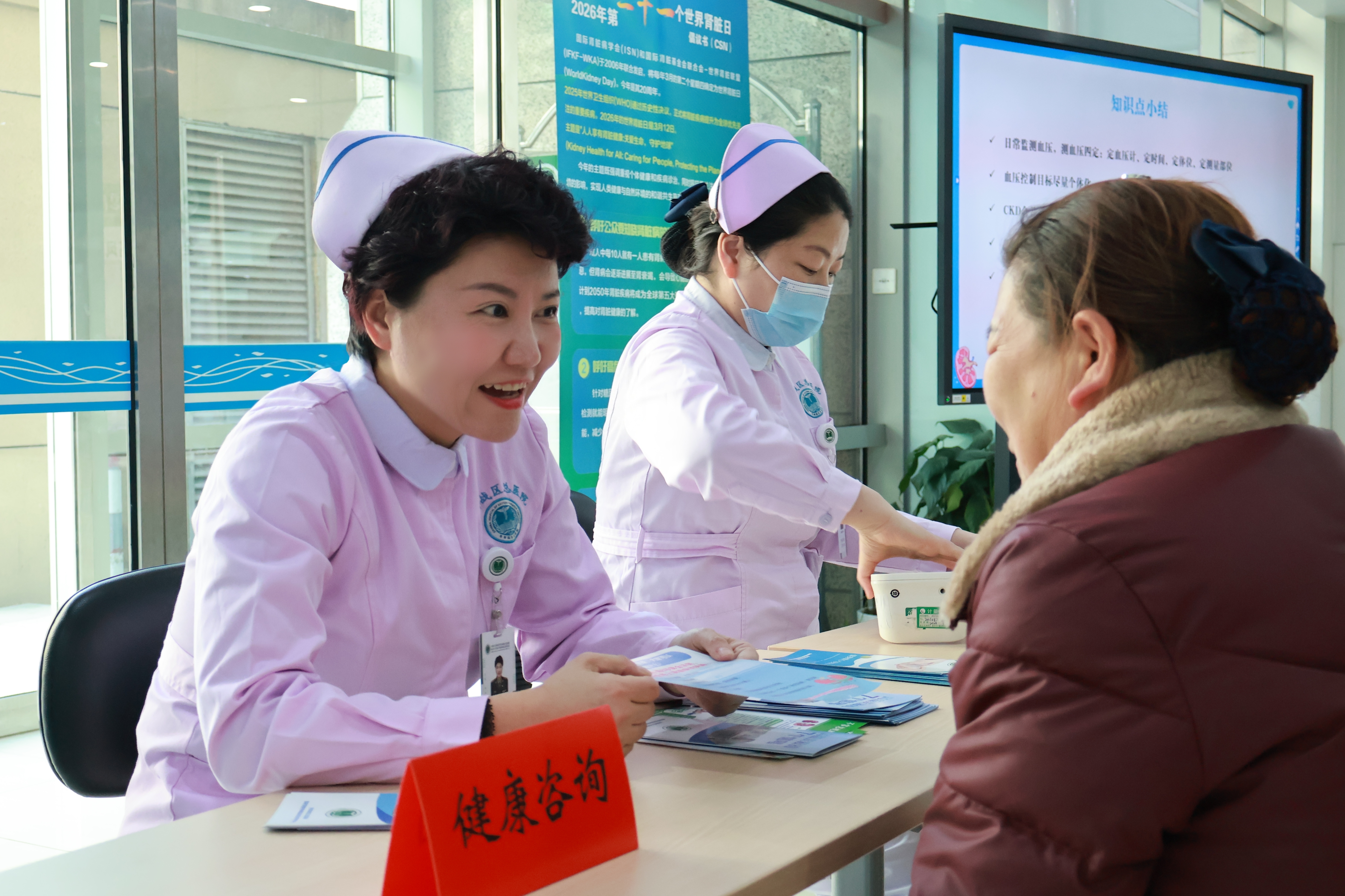 肾脏病科门诊以“科普赋能,健康续航” 为主题,打造“医-护-患” 联动课堂。医生团队开展《慢性肾脏病早期识别与管理》专题讲座,结合临床案例解析血肌酐、尿蛋白等指标的临床意义;护理团队同步开展血压、血糖免费检测,发放科普手册,围绕用药、生活习惯等提供个性化健康咨询,让专业医学知识转化为实用健康技能。