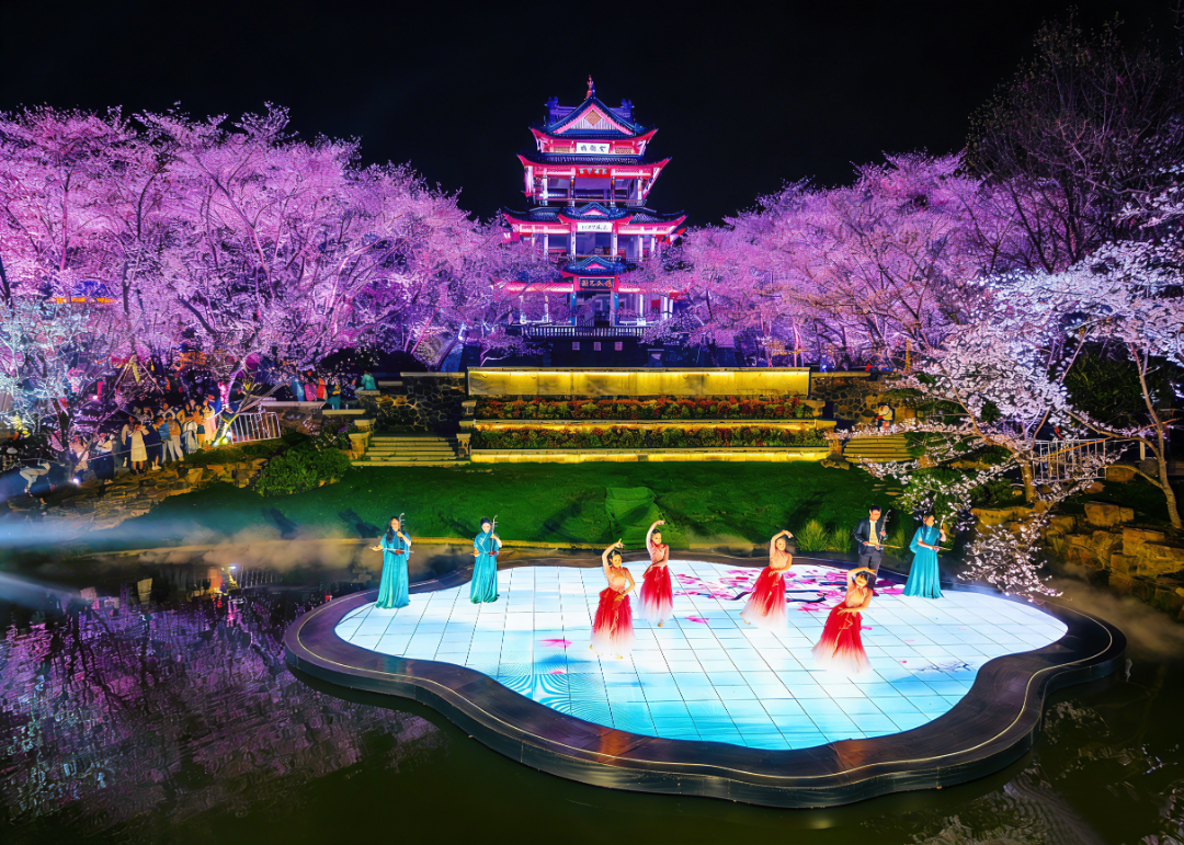 以赏樱楼为核心打造沉浸式夜樱视听体验,大屏光影、环境灯影与人物随身光源三重交织,层次丰富、动静相融,让赏樱者沉浸式置身光影与樱雪交织的春日盛宴。