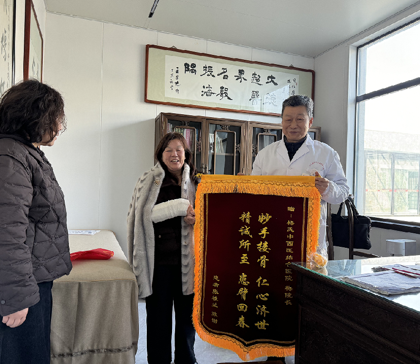 “梅院长,真是太感谢您了!我这手,现在一点都不疼了,恢复得这么好。”3月13日上午10时许,东台梅氏中西医结合医院门诊骨伤科一室,张女士脸上满是欣慰的笑意。一旁的女儿小心翼翼地递过一面鲜红的锦旗,郑重地交到正忙着检查张女士手臂的医院院长梅沛生手中。锦旗上“妙手接骨 仁心济世 精诚所至 患臂回春”十六个大字。