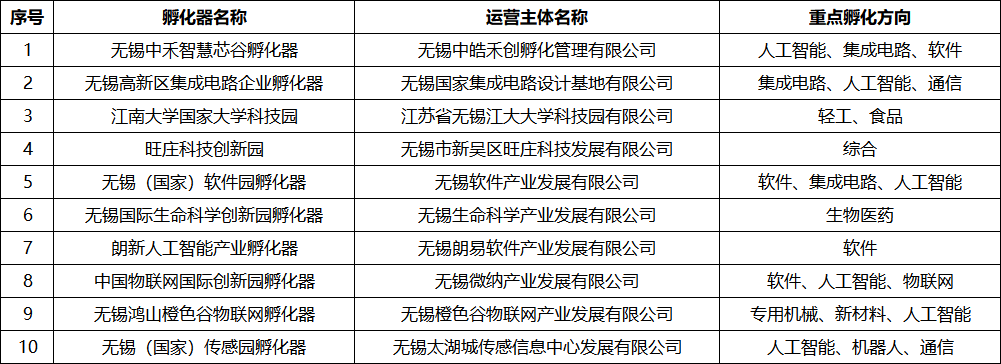 无锡高新区10家孵化器