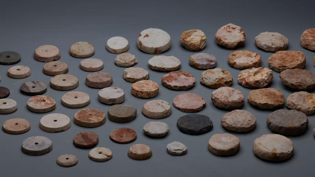 斗山遗址出土的石纺轮坯料、半成品及成品。(江苏省文物考古研究院供图)