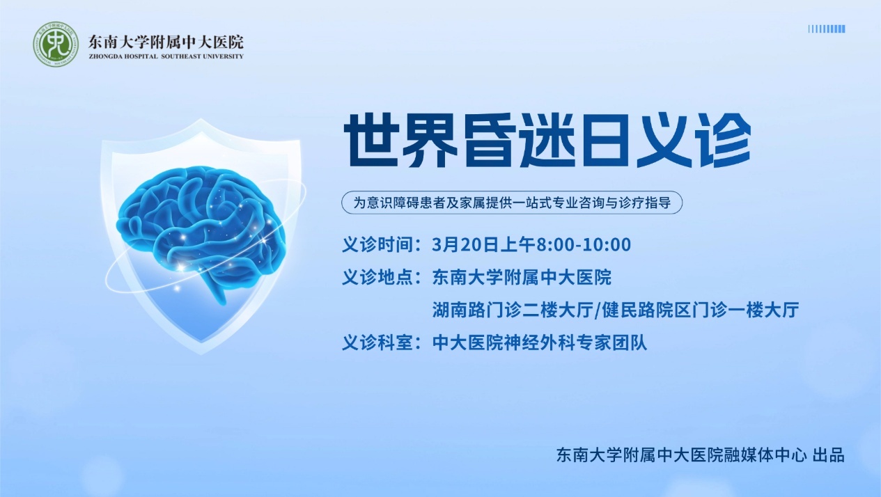每年3月22日是世界昏迷日,3月20日上午,东南大学附属中大医院神经外科在本部湖南路门诊二楼和健民路院区门诊一楼大厅同步开展义诊活动,集结专科骨干,为意识障碍患者及家属提供一站式专业咨询与诊疗指导。