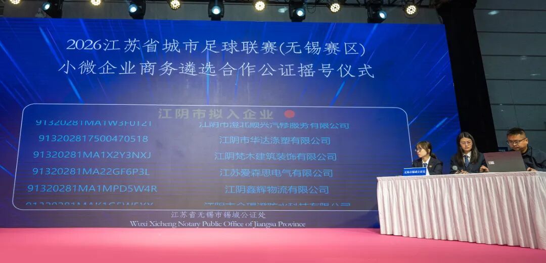 随后,备受关注的2026江苏城市足球联赛无锡赛区小微企业商务遴选摇号工作在锡城公证处的全程监督下进行,按照既定方案,摇号产生了第一轮遴选4家拟入选企业和4家备选企业、第二轮遴选42家拟入选企业和35家备选企业,即日起进入资格复审和公示环节,最终名单将在复核通过后正式公布。