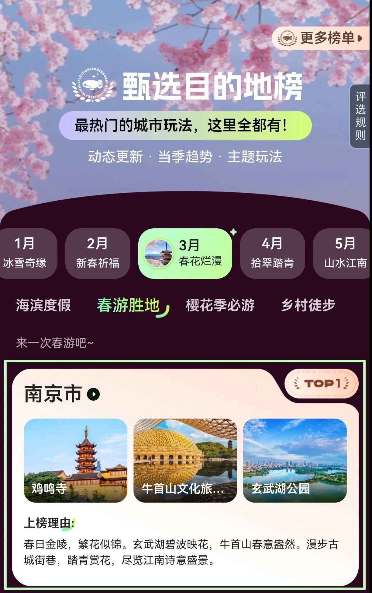 市场给出了最直接的反馈。同程旅行榜单上,南京的入选理由是:“春日金陵,繁花似锦。玄武湖碧波映花,牛首山春意盎然。漫步古城街巷,踏青赏花,尽览江南诗意盛景。”