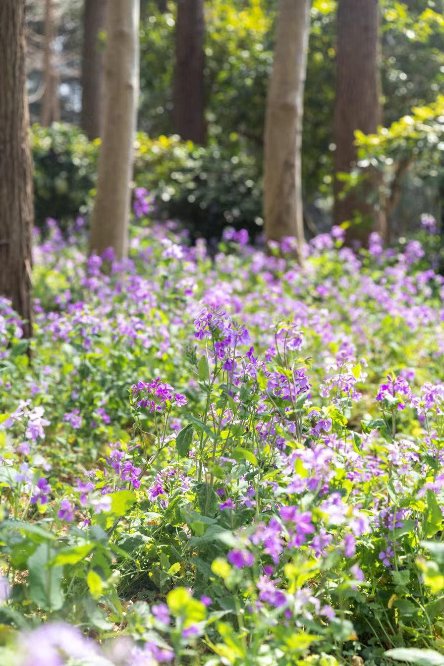 梅花山的晚梅与山脚下紫色的二月兰相映成趣。一个高洁,一个烂漫;一个在山坡,一个在平地。高低错落间,整个山坡被染成了紫色与粉色的渐变画卷。