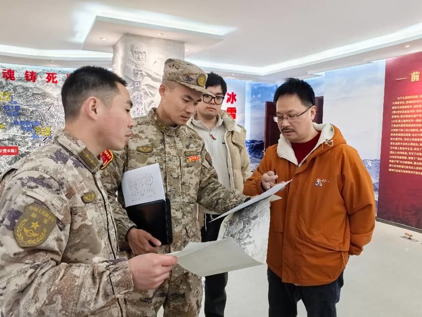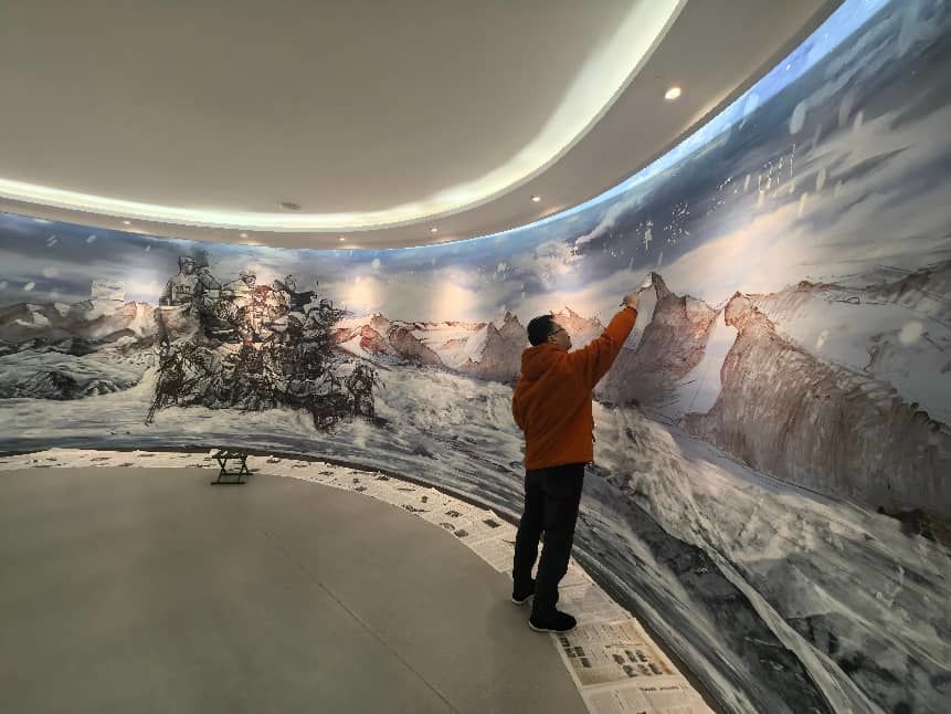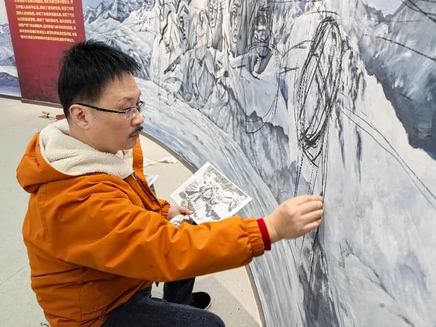 2月3日,寻访组成员杨爱国、鲁爱霖,美术教育工作者马斌及省书画协会会员夏俊季赶赴军营。他们接到一项重要任务:在冰雕连纪念馆一面宽8米、高2.8米的展示墙上,创作一幅全景式油画,展现这支英雄部队从东台组建、抗战整编,到解放战争中屡建奇功,再到抗美援朝长津湖战役中化作冰雕、直至新时代强军征程的完整历程。