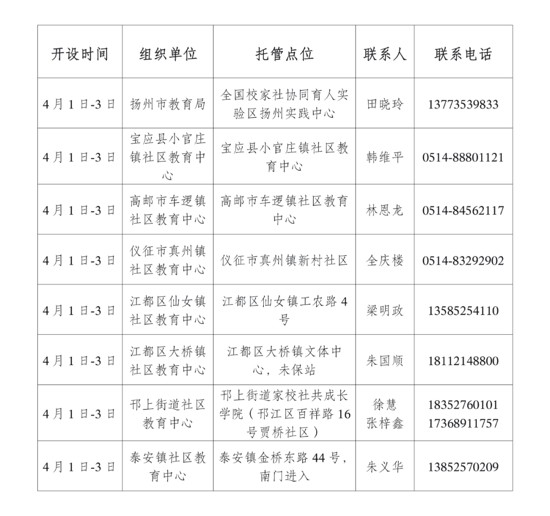 为切实解决学生家庭春假期间“看护难”问题,除学校为有意愿的学生提供到校托管外,扬州市教育局联合市总工会、团市委、市妇联,整合优质公益性资源,推出31个免费校外托管服务点,覆盖主城区及各县(市、区),就近为有需求的中小学生提供安全、充实、有意义的假期托管服务。