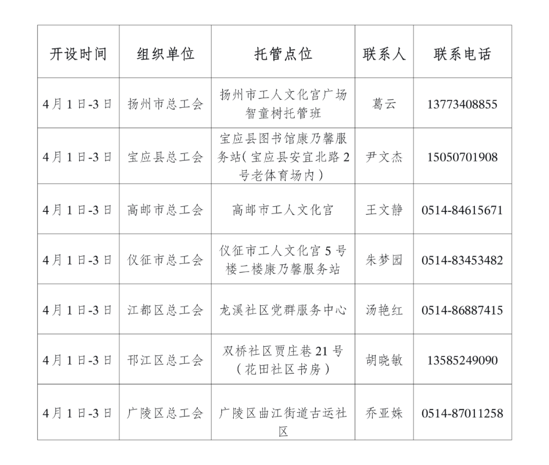 扬州市总工会联合各县(市、区)总工会推出“情暖工娃”春秋假职工子女托管服务,依托工人文化宫、职工服务中心等阵地,设立7个公益托管点,重点面向产业一线、劳模工匠、新就业形态劳动者职工子女。市级托管点服务设半托、全托两种模式,全托班提供免费营养午餐和午休照料,并开设观影赏析、劳模馆参观、户外运动等工会特色课程。