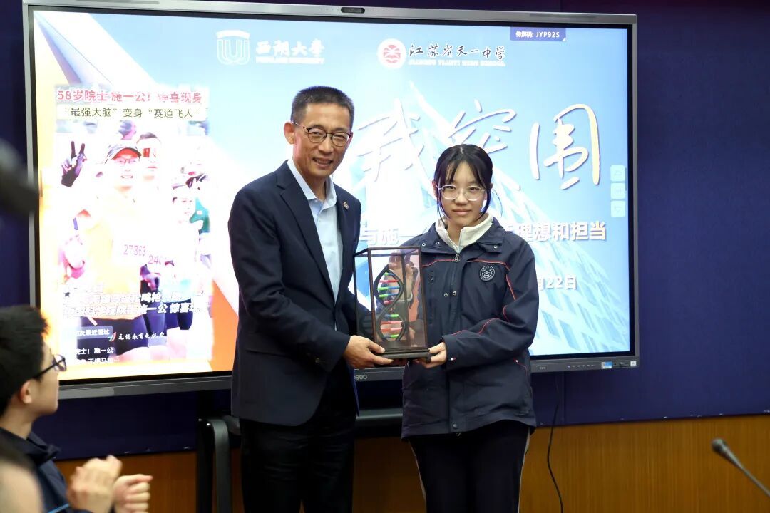 活动尾声,天一中学的学生代表为施一公院士送上3D打印的DNA双螺旋模型,这份凝结着少年巧思与科学向往的作品,既致敬生命科学的奥秘,也象征着学子们对科研探索的赤诚热爱。