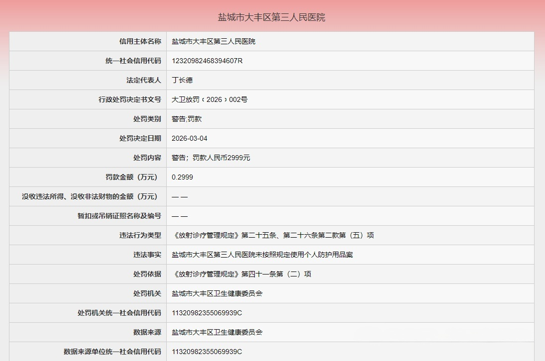 近日,据信用中国(江苏)通报,盐城市大丰区第三人民医院因未按照规定使用个人防护用品,被盐城市大丰区卫生健康委员会处以罚款人民币2999元的行政处罚。