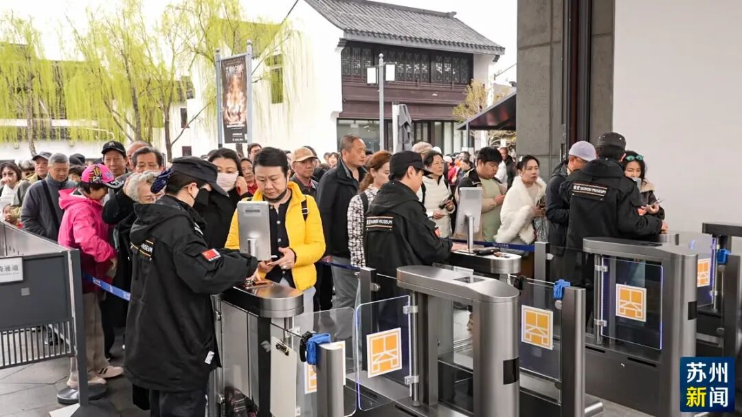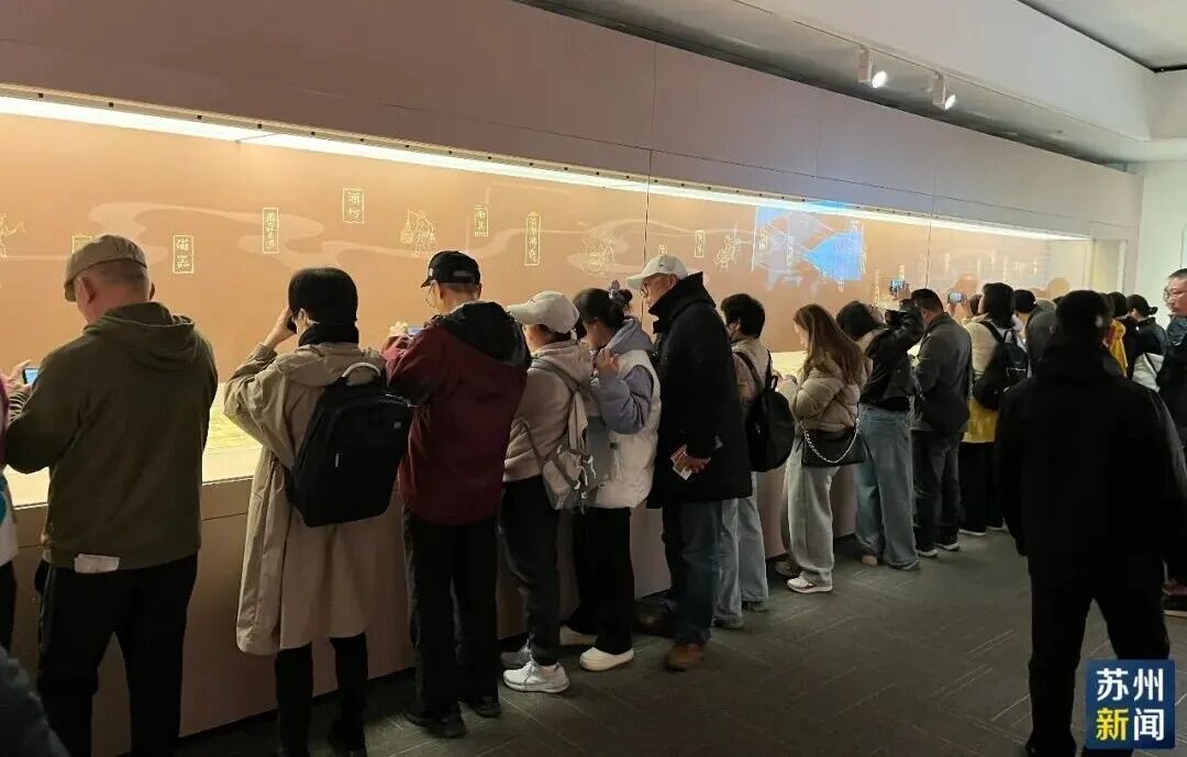 今天一早,苏州博物馆本馆门前排起长队,从东北街到临顿路,蜿蜒的队伍见首不见尾,许多市民游客早上7时许便已守候在此,只为一睹《清明上河图》(仇英本)真迹的风采。