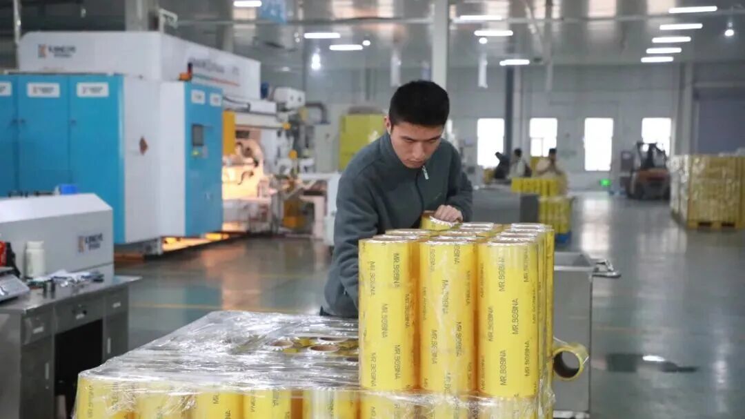 “实在是太忙了,每天都在加班加点,工人们都很辛苦。为了提升生产效率,新增了自动上纸管、自动卸换卷等先进设备,日产能高达30吨。”该企业生产经理潘太山介绍,目前企业正开足马力忙生产,生产线24小时运行,工人们实行倒班轮换制工作,以确保每一份订单都能准时交付。