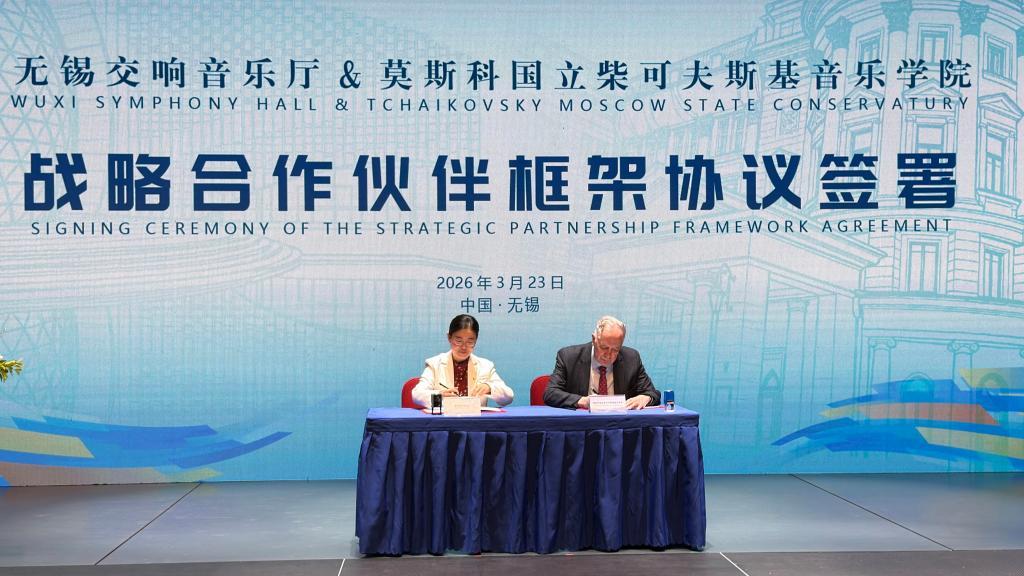 当天,在无锡新吴区新近落成的无锡交响音乐厅与莫斯科国立柴可夫斯基音乐学院签署战略合作框架协议。未来三年,双方将围绕音乐演出、艺术教育、学术交流及人才培养等重点领域,开展多层次、体系化合作,以音乐为纽带,进一步深化中俄文化交流。