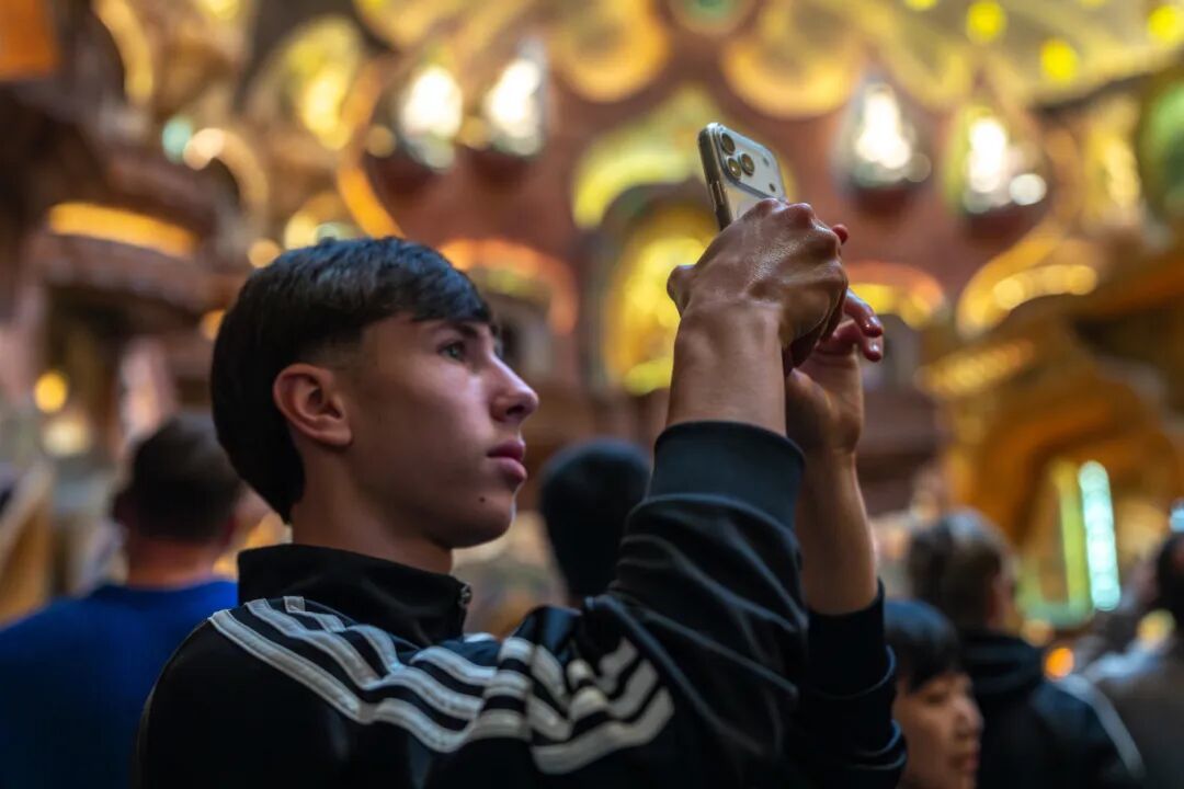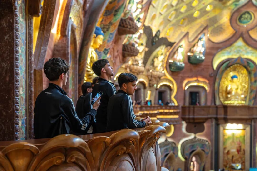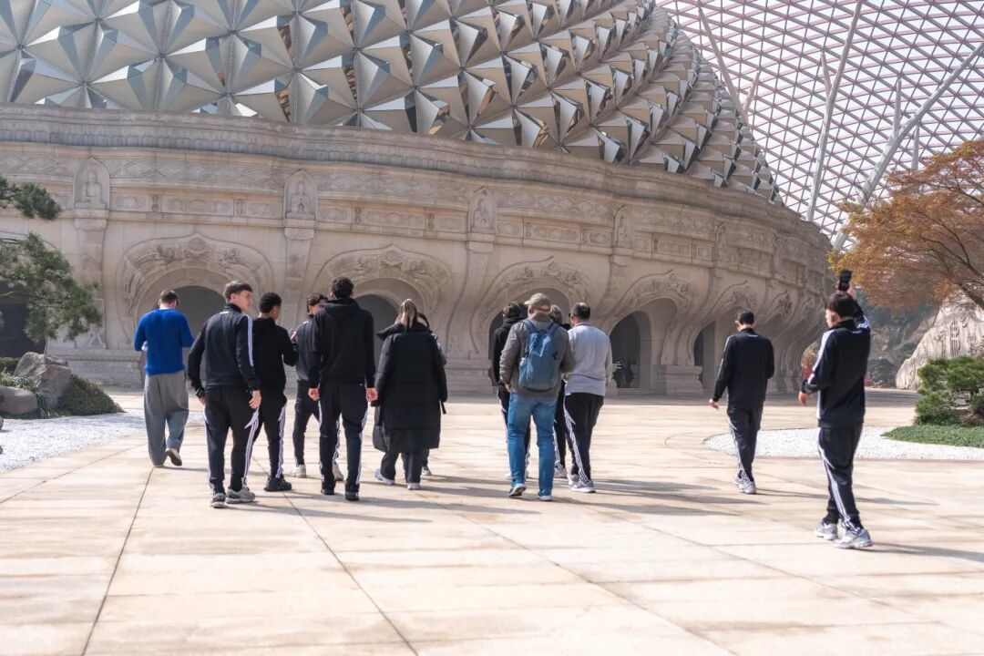 恰逢“春牛首”最佳游览时节,牛首山漫山繁花竞放,山水胜境相映成趣,成为意大利青少年邂逅金陵文化的第一站。上午9点半,这支堪称“意大利足球学霸”的队伍漫步山间,探访牛首山景区标志性建筑,于精巧的榫卯结构间触摸东方工艺之妙,在璀璨的穹顶艺术中体悟中华传统文化的深厚底蕴。