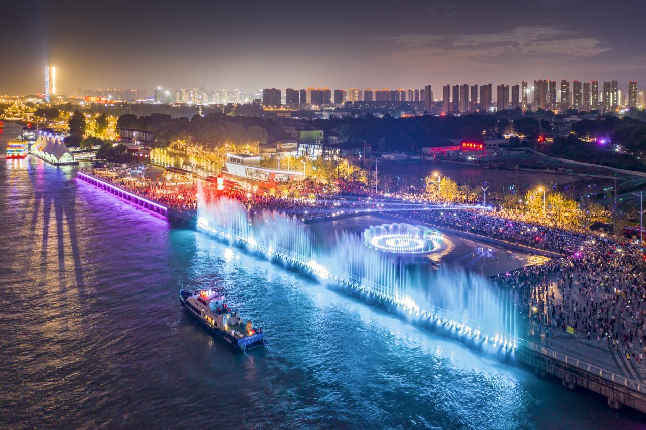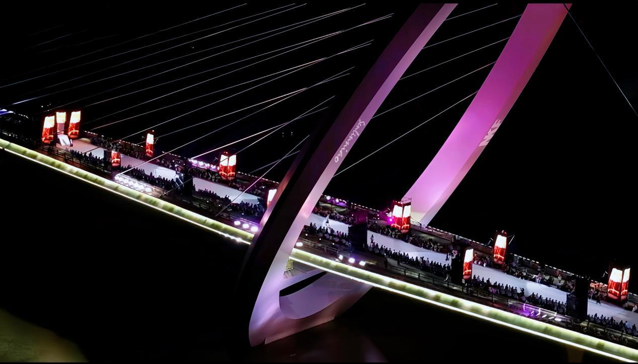 舞台依江而建,观众席侧向布局,以南京长江大桥为背景,全方位引入长江这一天然景观。江面如镜,将两岸繁华尽收其中,映照着江北新区走向未来的壮阔征程,见证着时尚产业在这里扎根生长、向上而行。