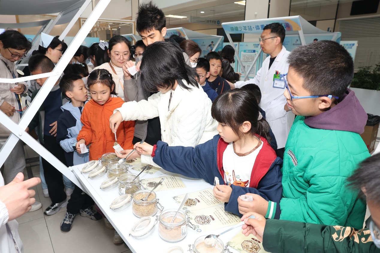 门诊一楼的文创市集热闹非凡。传统养生好物、特色中医文创琳琅满目,中药茶饮、中医膳食区香气扑鼻,茯苓饼、乌梅饮等特色,让孩子们直观感受“药食同源”的魅力,大家边逛边尝,亲手制作小香囊,在轻松氛围中加深对中医药文化的理解。