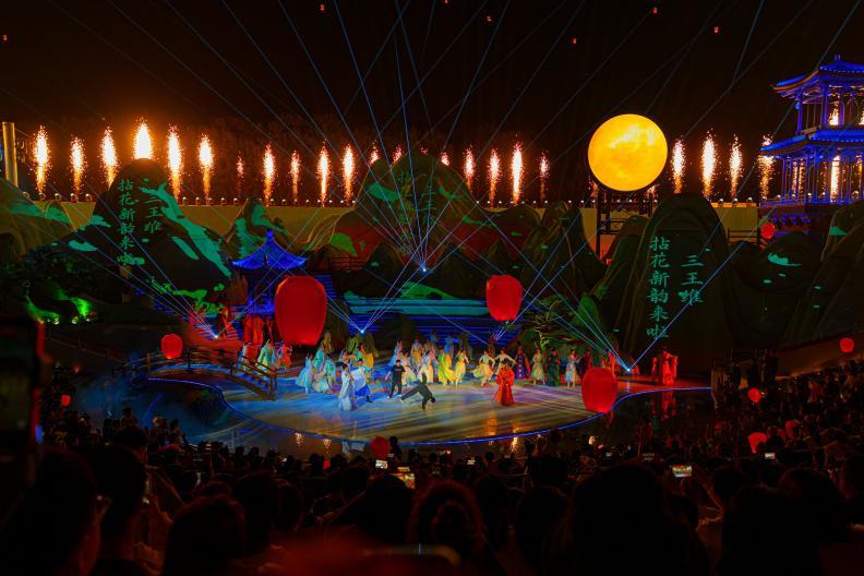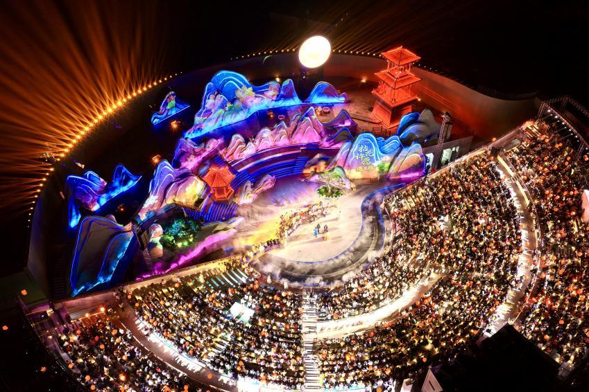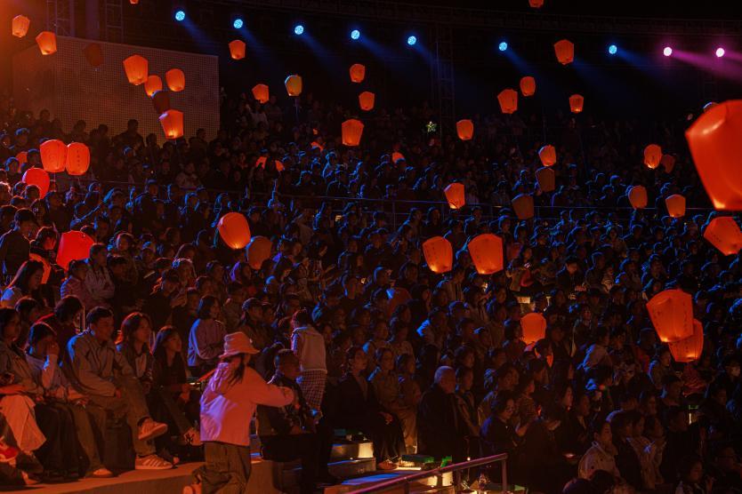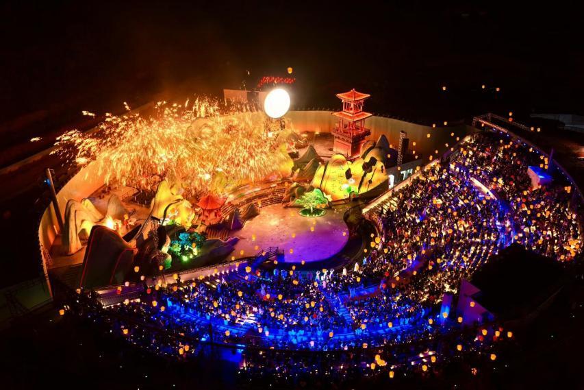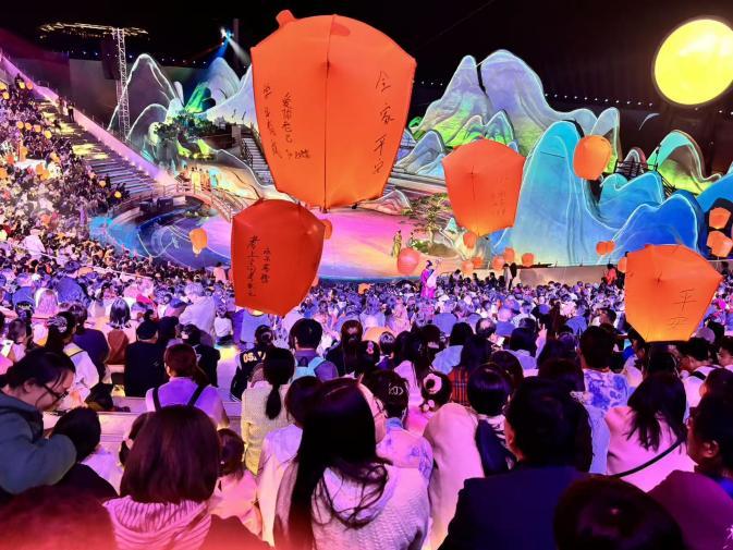 花海许愿广场的舞台融合光影科技,小桥流水、青峦叠嶂间,歌舞与诗情交融,演员与观众心愿同频。这座掩映于梵天花海旁侧的下沉式广场,舞台层层延展,将观众揽入其中,形成天然的聚拢与共鸣场域。在樱花与春光的映衬下,压轴登场的非遗打铁花将氛围推向高潮——漫天璀璨花雨与腾空而起的孔明灯、无人机编队绘就的祈愿灯海交相辉映,带来强烈的视觉冲击,让孩子在惊叹中感受非遗技艺与现代科技相遇时所迸发的魅力。这份直击心灵的感动,不仅是大人的治愈时刻,也是孩子成长路上难得的温暖记忆。