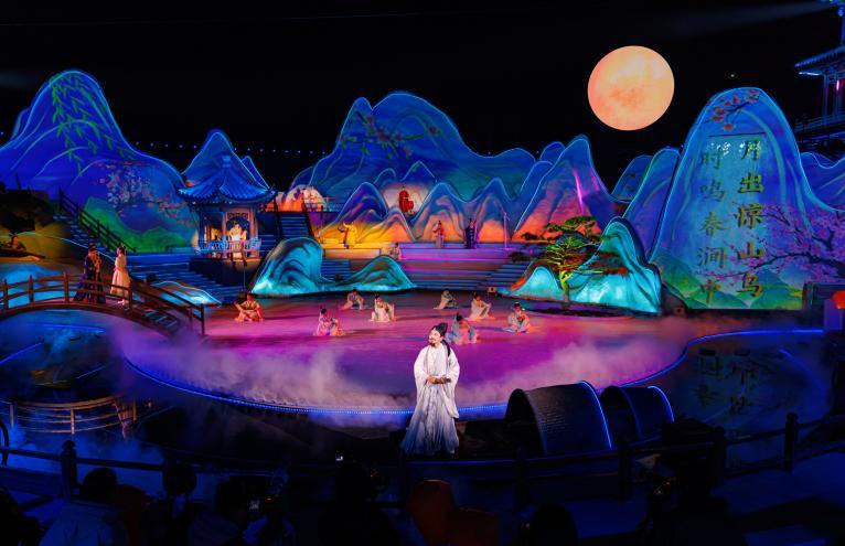 据介绍,《拈花许愿》以唐代诗人王维为文化IP,以诗入画,以景为幕。流光山色映皓月,唐风舞韵绕亭台,才子王维白衣挥袖,吟诵千古佳句;仙子凌空翩跹,衣袂流转间尽展东方雅韵。首演现场,当“王维”从古诗中走出,拱手诵诗,全场沸腾。家长们带着孩子与“王维”对诗接龙,孩子们在趣味互动中感受唐诗魅力;跟随跳脱搞怪的王维斗舞,在欢快的节奏中释放天性。一位家长兴奋地说:“这场演出比任何一堂语文课都生动!”