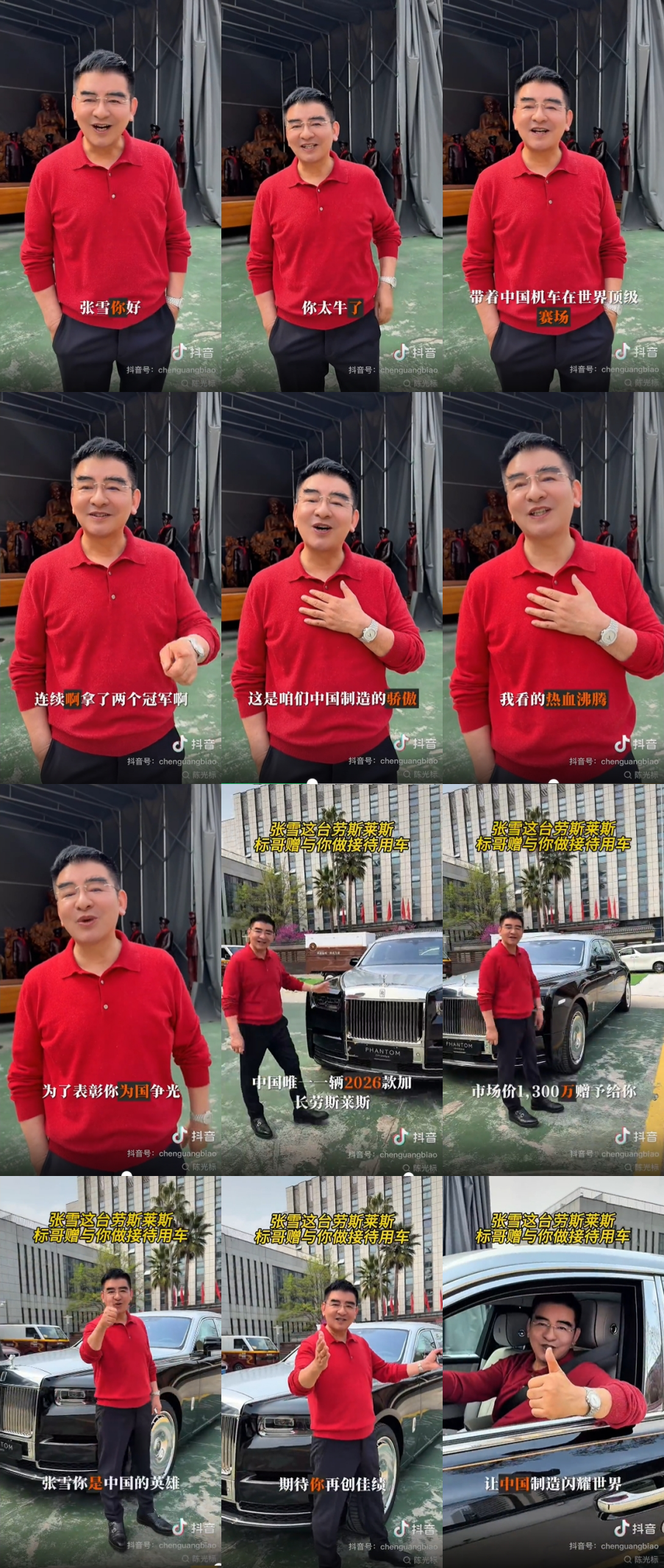 4月1日,陈光标公开宣布将价值1300万元的2026款加长劳斯莱斯幻影赠予张雪,以此表彰其为国争光的贡献,传递“为国拼搏者值得最高礼遇”的价值理念。