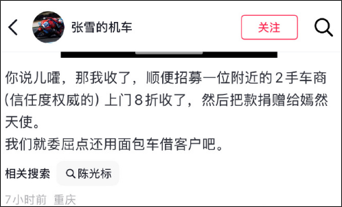 4月2日凌晨,张雪公开回应赠车提议,表示愿意接受这份好意,同时提议将车辆8折转售,所得款项全部捐赠给嫣然天使基金,企业仍保留原有简朴的接待方式。