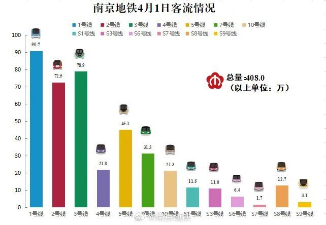 南京地铁的客流更是直接反映了春假热度:4月1日客流量达408万人次,比前一天猛增63.2万。
