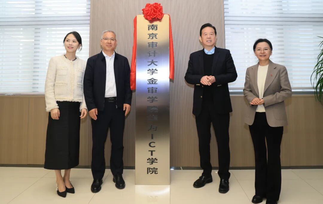 金审学院理事长胥正洋、副理事长侯思画与讯方技术总裁刘国锋、华为公司江苏政企教育医疗伙伴总监孙秋霓共同为南京审计大学金审学院华为ICT学院揭牌,标志着三方合作进入实质性落地阶段。