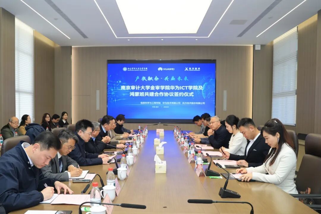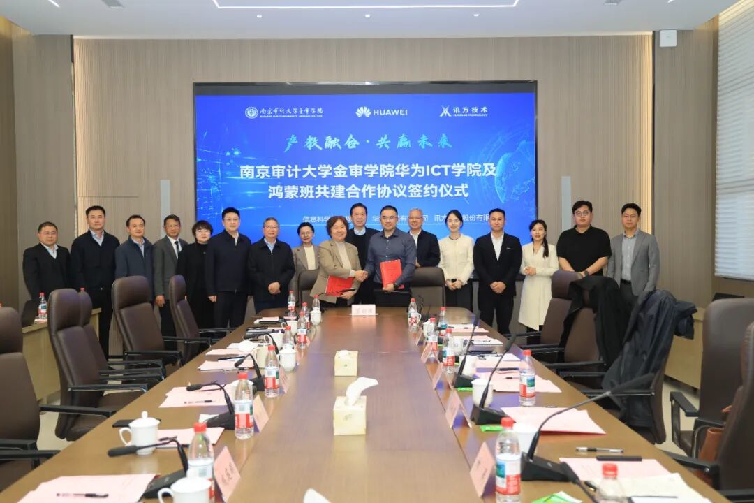 4月1日下午,南京审计大学金审学院华为ICT学院及华为鸿蒙班共建合作协议签约仪式在学校图书馆一楼会议室隆重举行。南京审计大学金审学院与华为技术有限公司、深圳市讯方技术股份有限公司三方携手共建华为ICT学院与华为鸿蒙班,同步启动鸿蒙全栈全场景实训室建设,以产教融合、校企协同、资源共享、共赢发展为宗旨,聚力打造ICT与鸿蒙生态人才培养高地,共同开启服务数字中国战略、培育高素质应用型人才的崭新篇章。