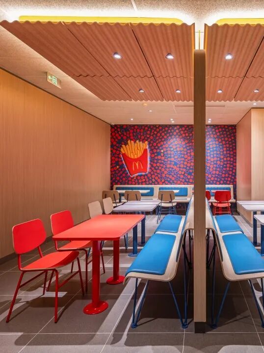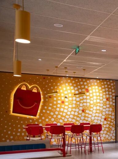 此家“欢趣层景(Vista)”麦当劳餐厅,这里集成了堂食、外带、麦乐送、麦咖啡等所有服务功能,400平方米的宽敞空间内,106个座位被巧妙划分,创新演绎了“近景与远景交融”的核心美学:靠窗的独立卡座以通透玻璃为幕,将地铁站外的街景化作流动的装饰画;中央的圆桌区采用暖色调灯光,适合三五好友围坐分享美食;角落的单人座位,则通过墙面俏皮的线条装饰与柔和光影,营造出专属的治愈感。