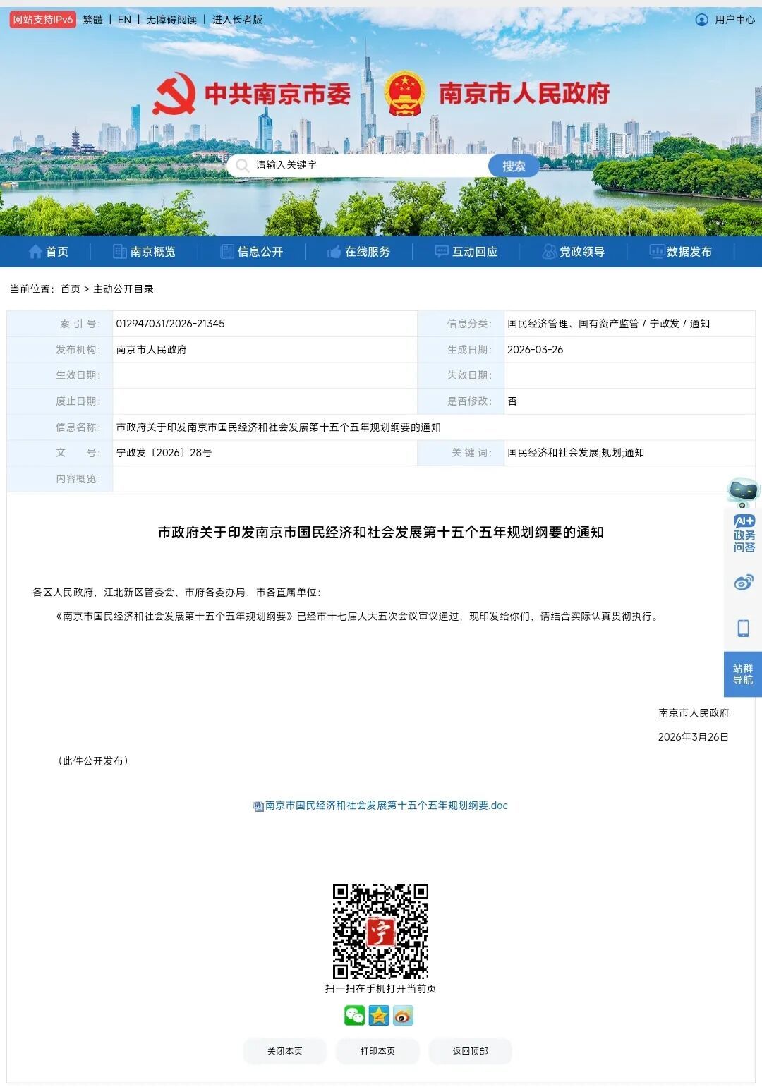4月7日,南京市人民政府在官网正式发布《南京市国民经济和社会发展第十五个五年规划纲要》(以下简称《纲要》)。《纲要》为南京新五年发展勾勒出清晰蓝图,明确“十五五”经济社会发展主要指标:地区生产总值年均增长5%以上,制造业增加值占比保持稳定,居民人均可支配收入增长与经济增长保持同步,人均预期寿命≥85岁。