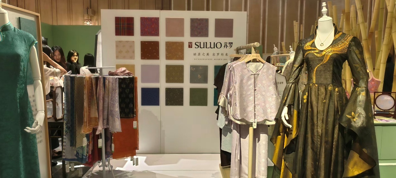 现场,苏州丝绸元素精彩纷呈、亮点突出。其中,宋锦领域,上久楷、钱小萍宋锦坊两大苏州品牌登场:上久楷以科技突破宋锦量产瓶颈,推出“江南采莲”礼盒、改良宋锦服饰等产品,其百余款作品曾作为外交国礼赠送外国首脑;钱小萍宋锦坊由国家级传承人钱小萍领衔创立,推出枇杷山雀纹锦、十二星座等特色作品,兼具古法韵味与当代审美。