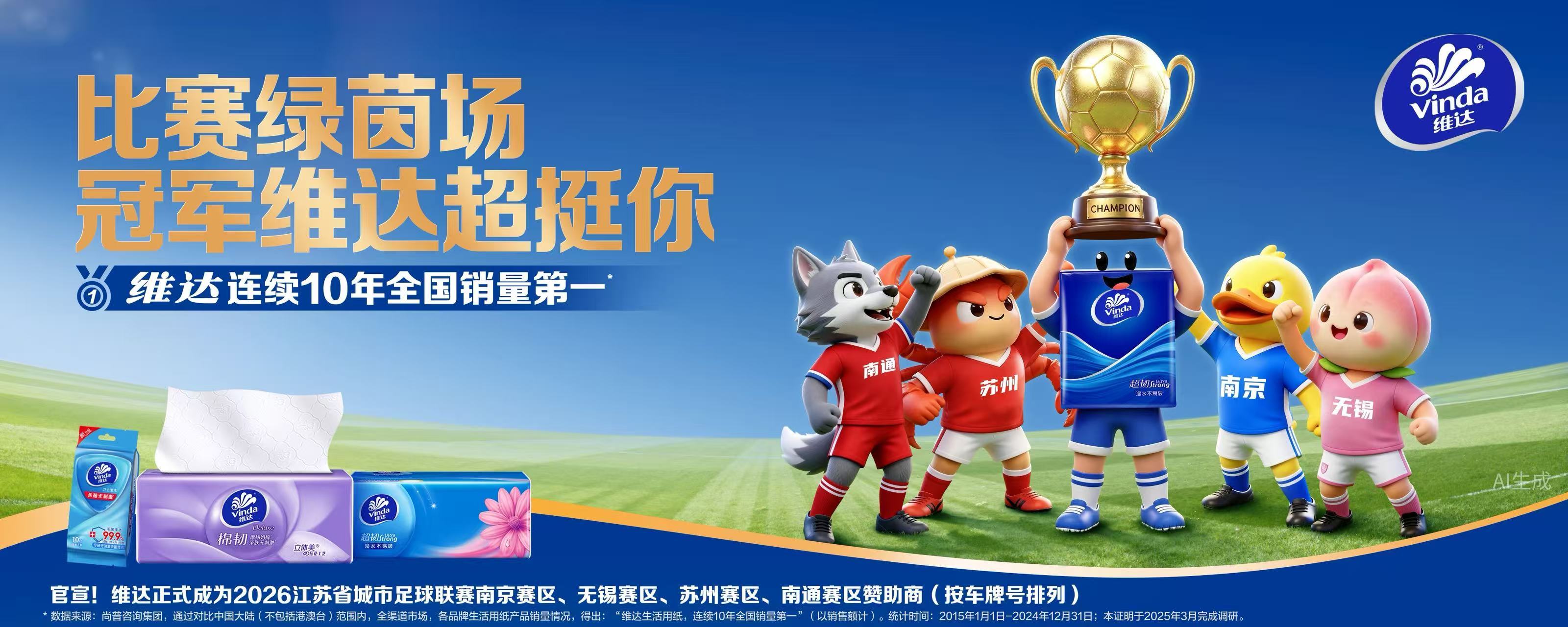 品牌韧性,是维达与亿万家庭建立的精神连接。“韧性”不仅是产品物理属性,更是面对挑战永不放弃的生活态度。2025年,维达官宣乒乓球世界冠军孙颖莎为品牌全球代言人,让“韧性”从口号变为精神共鸣。就在展前一周,维达正式官宣成为2026赛季江苏省城市足球联赛(苏超)南京、无锡、苏州、南通四大赛区赞助商,南京“宁不服”、无锡“锡必胜”、苏州“苏不了”、南通“通天下”,四城的拼搏口号与维达“超韧”基因形成精神共鸣。