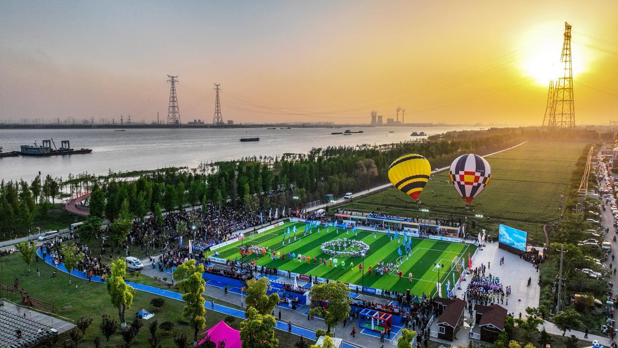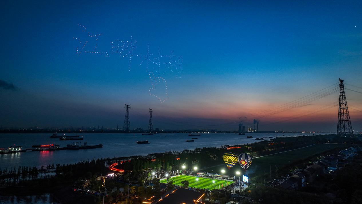 绿茵赛场激情澎湃,江畔风光岁月静好。来自各地的观众漫步在新合村江畔彩虹桥,欣赏长江日落,邂逅芦苇湿地,打卡世界最高输电铁塔,体验宝藏乡村的“诗与远方”。精彩比赛中,五彩斑斓的靖江本土品牌热气球带来浪漫氛围,展现出靖江低空经济活力;300架无人机编队以浩瀚夜空为幕,光影流转间将村超赛事主题、靖江特色名片一一铺展,勾勒出靖江乡村振兴、城市欣欣向荣的壮美图景。
