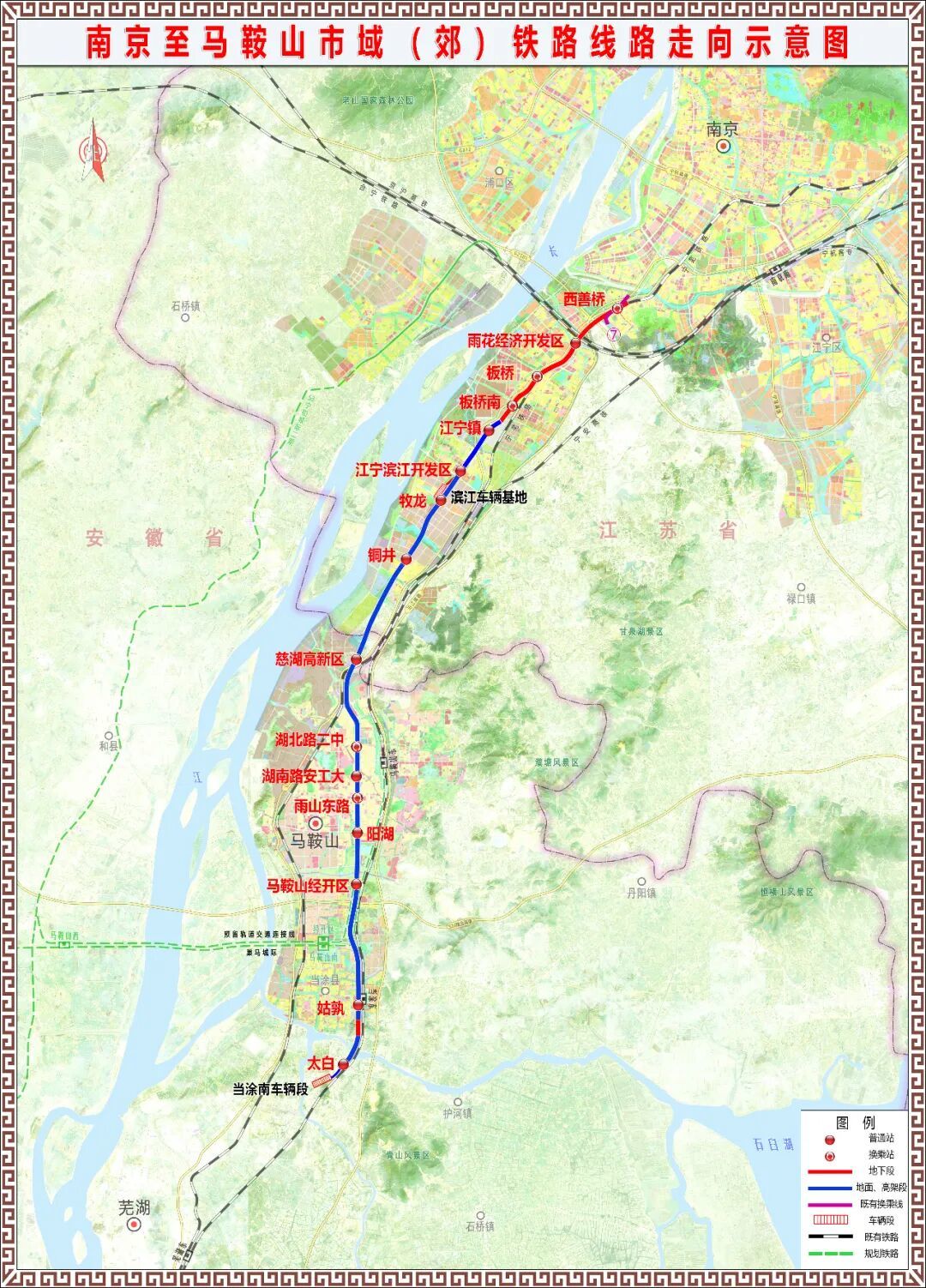 宁马市域(郊)铁路起自南京市西善桥站,终至马鞍山市太白站,途经南京板桥新城、滨江新城,马鞍山花山区、雨山区、当涂县,线路全长约54.23km,共设16座车站(其中南京段8站,马鞍山段8站)。车辆采用市域B型车,设计最高运行速度120公里/小时。随着宁马市域(郊)铁路开通运营,将大幅缩短南京与马鞍山双城时空距离,推动区域产业协作、人才流动与资源共享,助力长三角更高质量一体化发展,南京将成为全国唯一地跨两省且外联多个城市的都市圈中心。