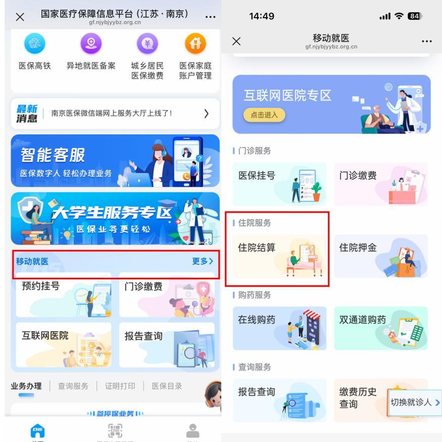 下拉菜单栏,找到移动就医模块,点击“更多”→“住院结算”;
