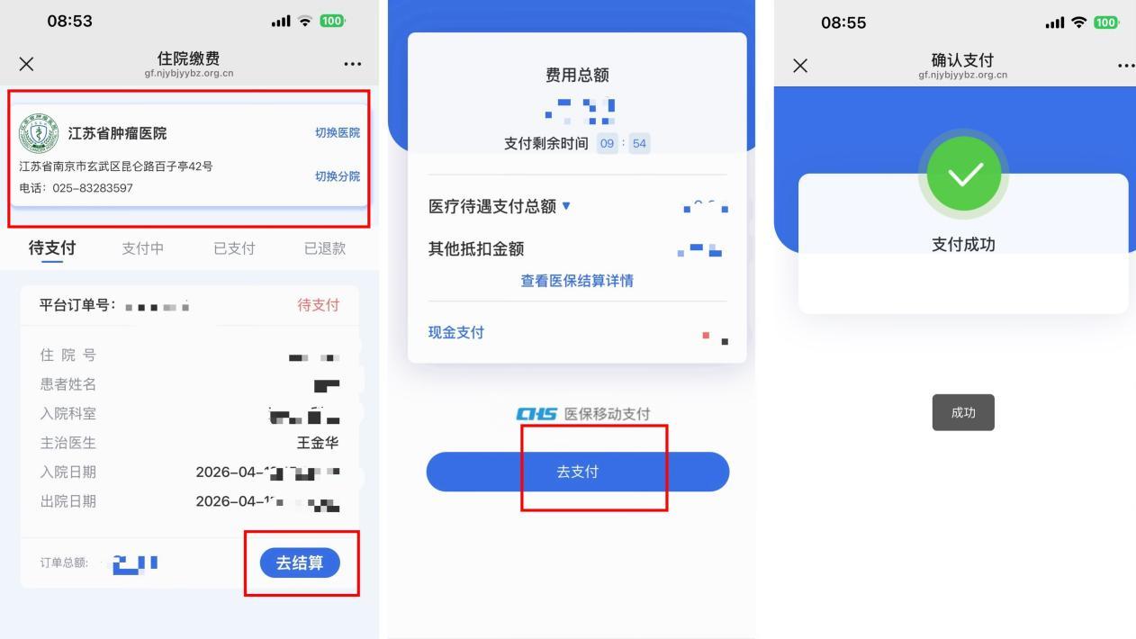 切换医院(江苏省肿瘤医院),进行费用确认后点击“去结算”→“去支付”后完成结算。