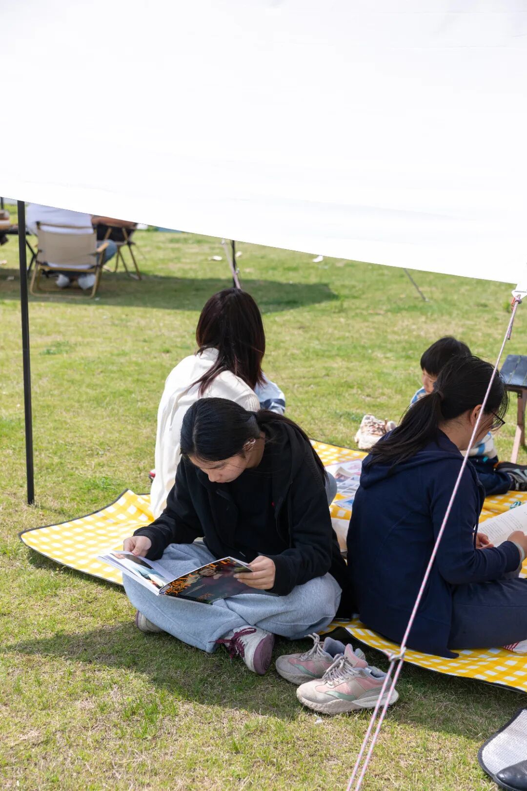 一旁的书籍摊位前人气满满,大家精心挑选心仪读物后,走进帐篷阅读区安静落座。专注阅读的时光里,只闻翻书声与风声。许多居民在享受这个宁静的午后阅读瞬间的同时,也收获了“饮品糕点通兑券”及图书等奖励,用专注换来了一份春日的小甜蜜。