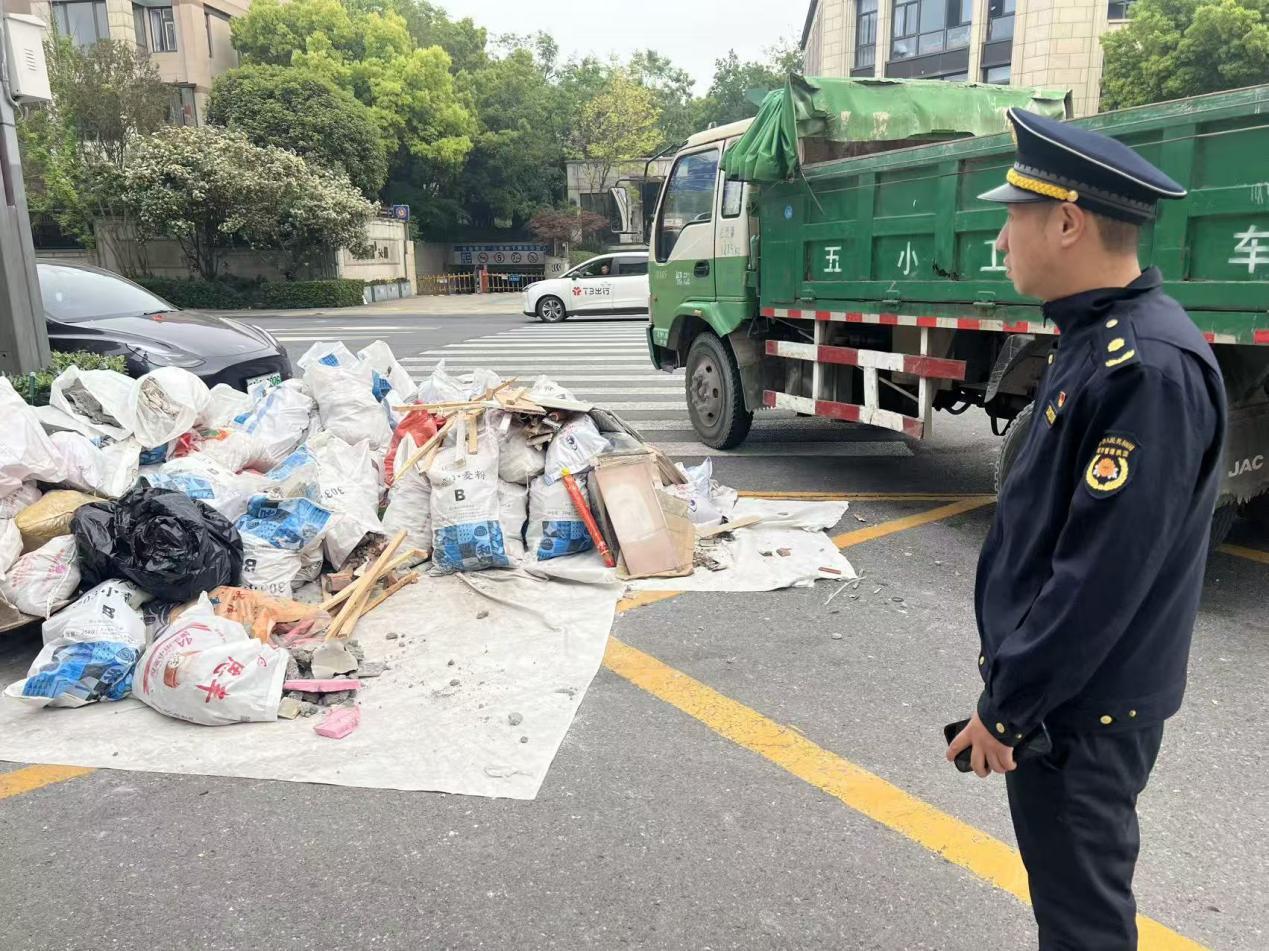 4月16日,南京市江心洲街道城管中队在绿水街开展日常巡查时,发现一处临时堆放的建筑垃圾。现场袋装废料、装修杂物随意堆放在道路旁,不仅占用公共通行空间、影响市容环境,也给过往行人车辆带来安全隐患。