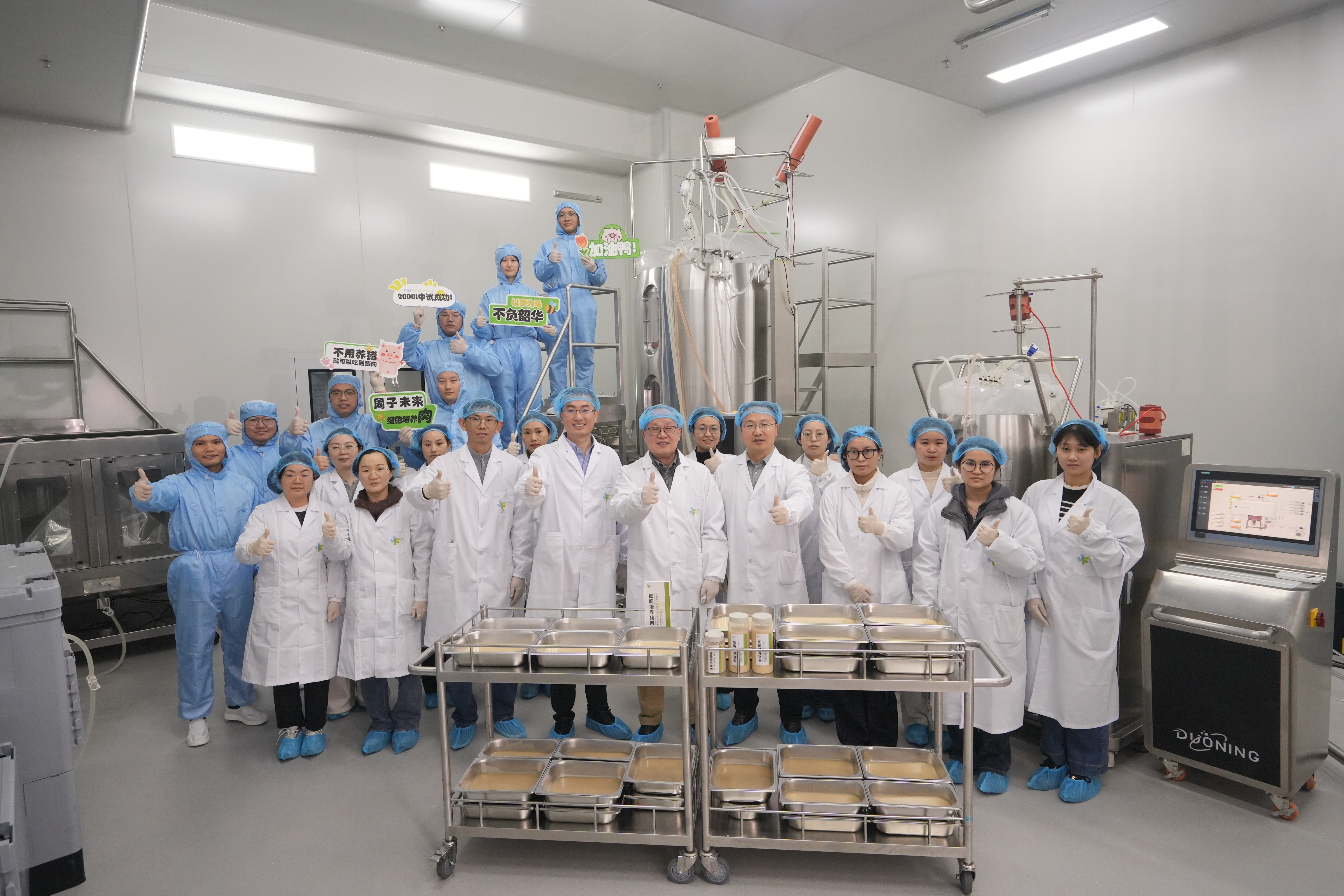 在此基础上,实验室继续向更高目标迈进。2025年12月,实验室再度刷新纪录——联合周子未来新建成国内规模最大的细胞培养肉中试工厂,成功实现全球首次细胞培养猪肉2000升生物反应器规模化试生产。